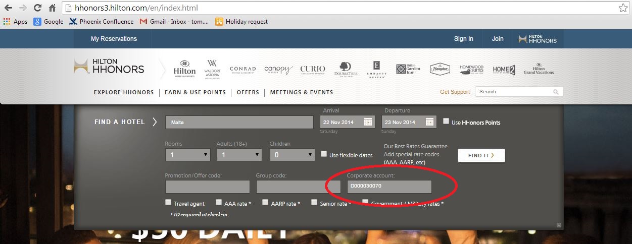 To benefit from the offer, which is essentially a “friends and family” rate for Hilton workers, you simply need to click here and enter it into the “corporate account” box, as follows: