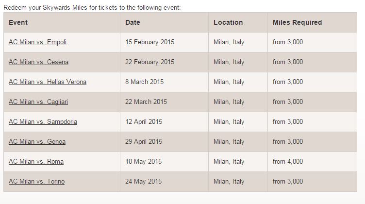 Not only can you get general admission tickets, you can also use miles to “buy” your way into the VIP executive box, with full catering etc, at impressive mileage costs. We set out both the full cost of tickets and available fixtures below.